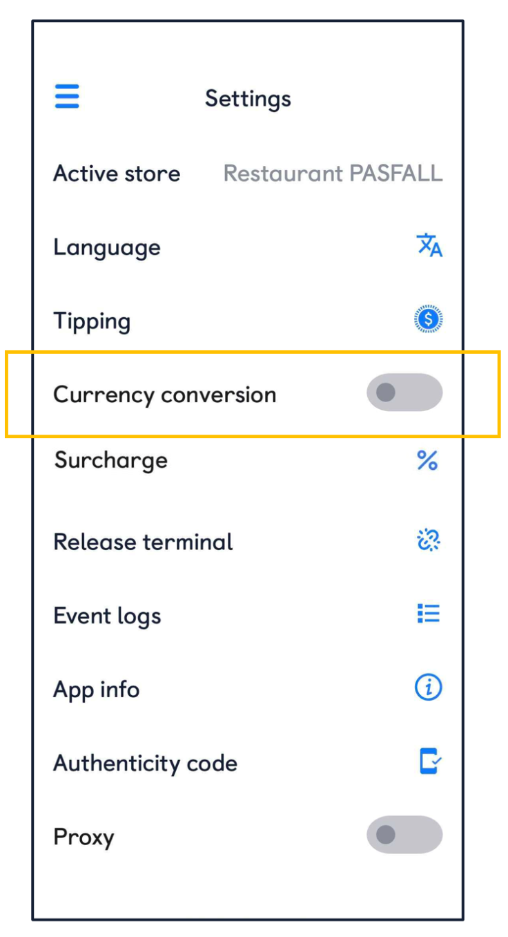DCC will automatically be enabled when the feature is available on the Softpay merchant. By going to the settings menu in Softpay app, the toggle "Currency conversion" allows you to control it at app level.